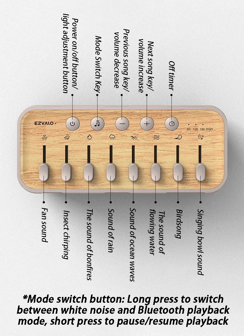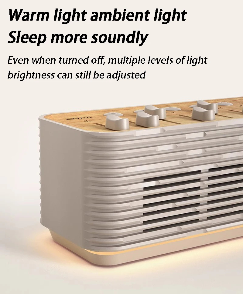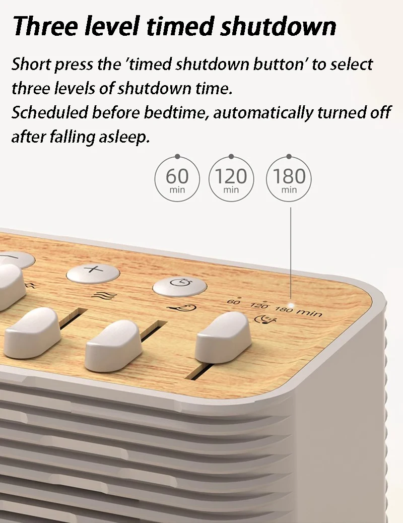 The device offers a selection of natural sound options intended to fade into the background rather than demand attention. Simple physical controls make it easy to set once and leave running, supporting rest, reading, or quiet moments throughout the day or evening.